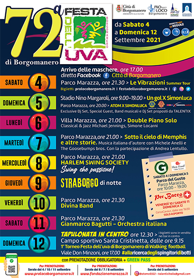 Da sabato 4 settembre a domenica 12 settembre 2021 torna a Borgomanero, in provincia di Novara, la storica Festa dell'Uva. Il programma è ricco di appuntamenti, tra cui la Tapulonata in centro, che si terrà domenica 12 alle ore 12:30 (i biglietti sono in vendita nei bar in centro).